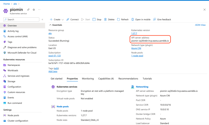 Of course, we can manage the cluster using Azure Portal. However, we can also easily switch to the kubectl CLI. Here’s the Kubernetes API server address for our cluster: piomin-xq30re6n.hcp.eastus.azmk8s.io.