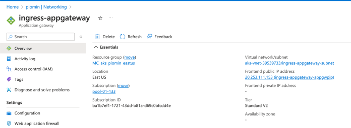 Once it is ready, you can display its details. The ingress-appgateway object exists in the same virtual network as Azure Kubernetes Service. There is a dedicated resource group – in my case MC_aks_piomin_eastus. The gateway has the public IP addresses assigned. For me, it is 20.253.111.153 as shown below.