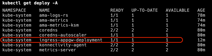 After installing the Azure Application Gateway addon on AKS, there is a new Deployment ingress-appgw-deployment responsible for integration between the cluster and Azure Application Gateway service. It is our ingress controller.
