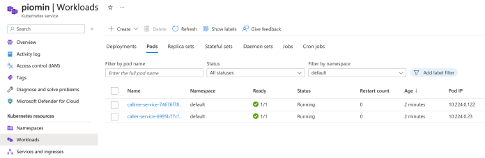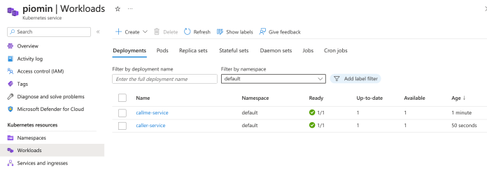 Let’s switch to the Azure Portal. In the Azure Kubernetes Service page go to the workloads section. As you see, there are two Deployments: callme-service and caller-service.