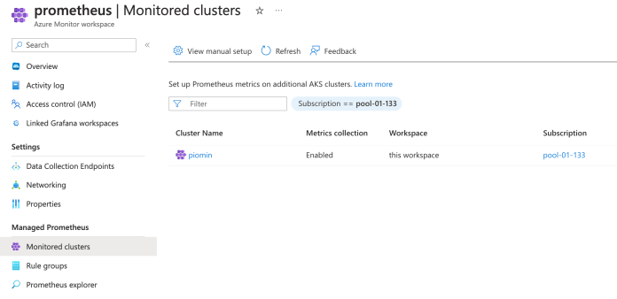 In order to access Prometheus metrics for our AKS cluster, we need to go to the prometheus Azure Monitor workspace. In the first step, let’s take a look at the list of clusters assigned to that workspace.