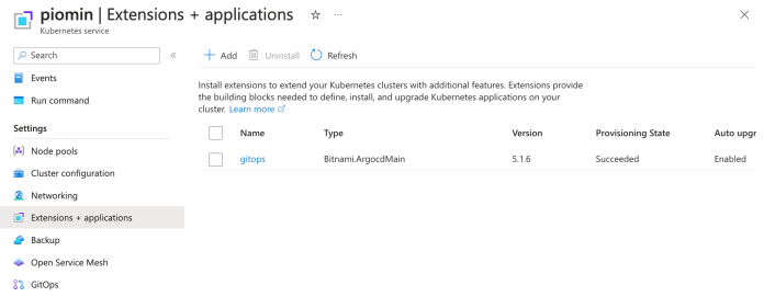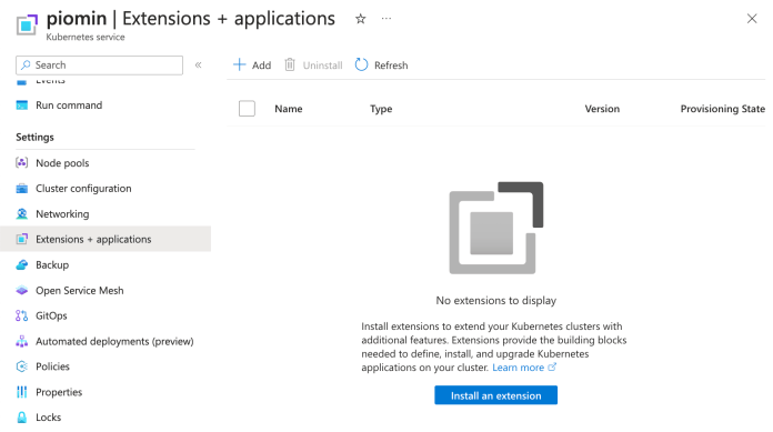 We have already created a Kubernetes cluster, run the apps there, and exposed them to the external client. Now, the question is – how Azure may help in other activities. Let’s say, we want to install some additional software on the cluster. In order to do that, we need to go to the “Extensions + applications” section on the AKS cluster page. Then, we have to click the “Install an extension” button.