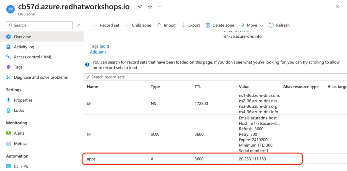 And the last thing. As you remember, we exposed our apps outside the AKS cluster under the IP address. What about exposing them under the DNS name? Firstly, we need to have a DNS zone created on Azure. In this zone, we have to add a new record set containing the IP address of our application gateway. The name of the record set indicates the hostname of the gateway. In my case it is apps.cb57d.azure.redhatworkshops.io.