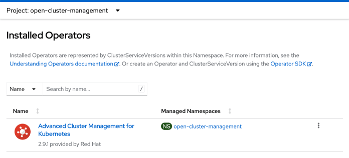 In the first step, we must install the Advanced Cluster Management for Kubernetes (ACM) on OpenShift using an operator. The default installation namespace is open-cluster-management. We won’t change it.