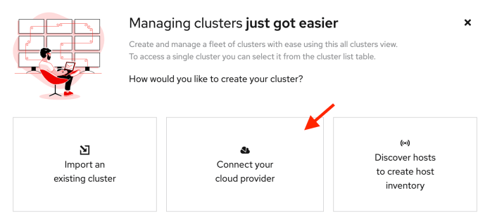 Advanced Cluster Management for Kubernetes allows us to import the existing clusters or create new ones on the target infrastructure. In this exercise, you see how to leverage the cloud provider account for that. Let’s just click the “Connect your cloud provider” tile on the welcome screen.