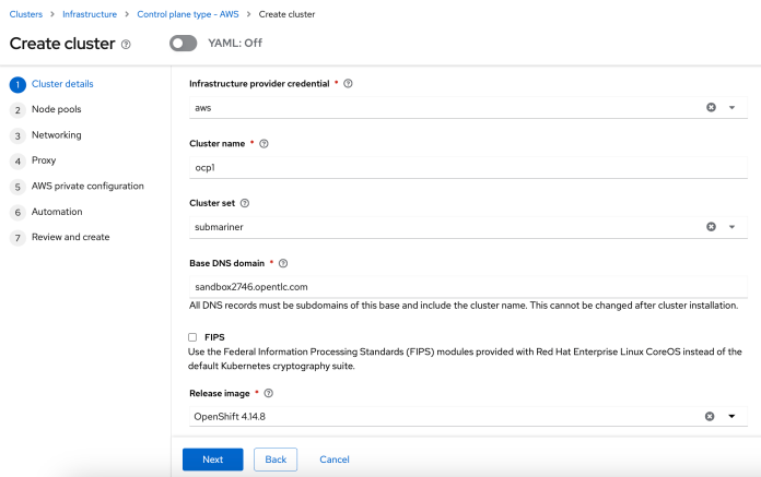 In the “Cluster Details” form we should set the name (ocp1 and then ocp2 for the second cluster) and version of the OpenShift cluster (the “Release image” field). We should also assign it to the submariner cluster set.