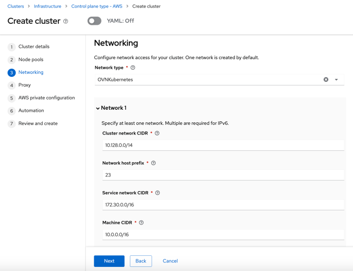 Let’s take a look at the “Networking” form. We won’t change anything here intentionally. We will set the same IP address ranges for both the ocp1 and ocp2 clusters. In the default settings, Submariner requires non-overlapping Pod and Service CIDRs between the interconnected clusters. This approach prevents routing conflicts. We are going to break those rules, which results in conflicts in the internal IP addresses between the ocp1 and ocp2 clusters. We will see how Submariner helps to resolve such an issue.