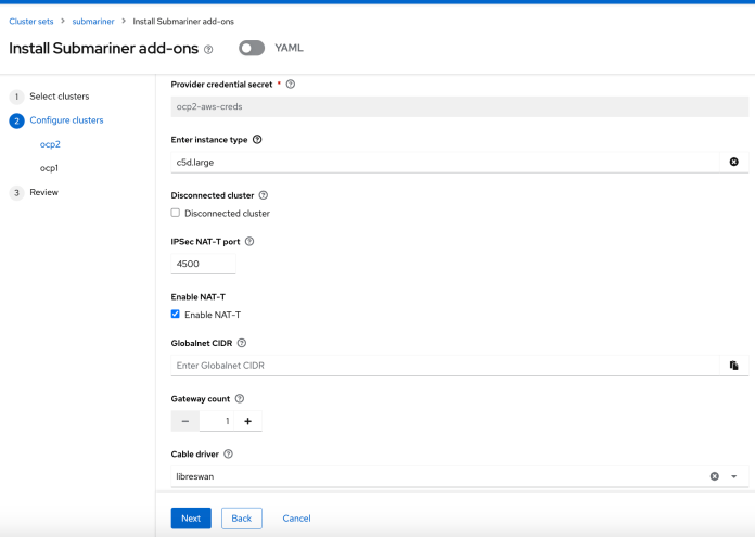 In the next form, we are configuring Submariner installation in each OpenShift cluster. We don’t have to change any value there. ACM will create an additional node on the OpenShift cluster using the c5d.large VM type. It will use that node for installing Multus CNI. Multus is a CNI plugin for Kubernetes that enables attaching multiple network interfaces to pods. It is responsible for enabling the Submariner “Globalnet” feature and giving a subnet from this virtual Global Private Network, configured as a new cluster parameter GlobalCIDR. We will run a single instance of the Submariner gateway and leave the default libreswan cable driver.