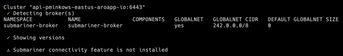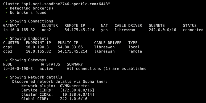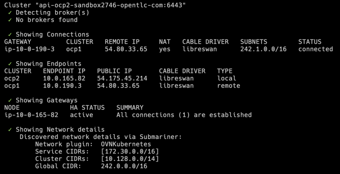 Here’s the output for the ocp1 managed cluster. The global CIDR for that cluster is 242.1.0.0/16. This IP range will be used for exposing services to other clusters inside the same Submariner network.