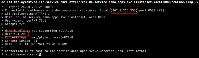 Submariner exposes services on the domain clusterset.local. So, our service is now available under the URL callme-service.demo-apps.svc.clusterset.local. We can verify it by executing the following curl command inside the caller-service container. As you see, it uses the external IP address allocated by the Submariner within the “Globalnet” subnet.