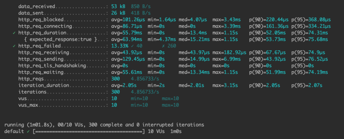 There were some errors during the warm-up. However, the test shows that our scenario works on the Kubernetes cluster.