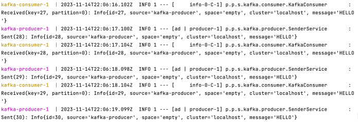 Let’s begin with the producer app. It generates and sends one message per second. Here’s the implementation of a @Service bean responsible for producing messages. It injects and uses the KafkaTemplate bean for that.