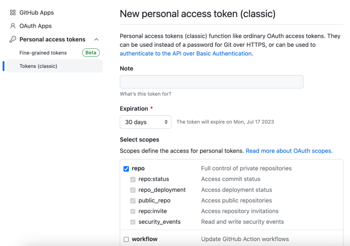Finally, you also need to have an account on GitHub. In our scenario, ArgoCD will require access to the repository to obtain a list of opened pull requests. Therefore, we need to create a personal access token for authentication over GitHub. In your GitHub profile go to Settings > Developer Settings > Personal access tokens. Choose Tokens (classic) and then click the Generate new token button. Then you should enable the repo scope. Of course, you need to save the value of the generated token. We will create a secret on Kubernetes using that value.