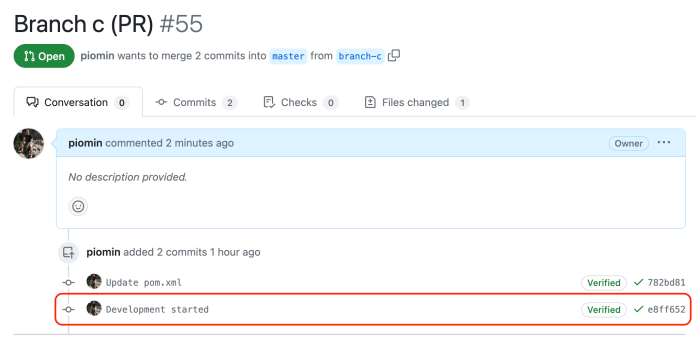 Let’s take a look at one of our pull requests. Firstly, pay attention to the pull request id (55) and a list of commits assigned to the pull request.