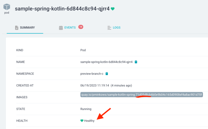 Let’s display a list of running pods in the preview-branch-c namespace: