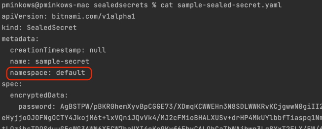The result may be quite surprising. Sealed Secrets doesn’t allow encrypting secrets without a namespace set in the YAML manifest. That’s because, by default, it uses a strict scope. With that scope, the secret must be sealed with exactly the same name and namespace. These attributes become part of the encrypted data. For me, it adds the default namespace as shown below.