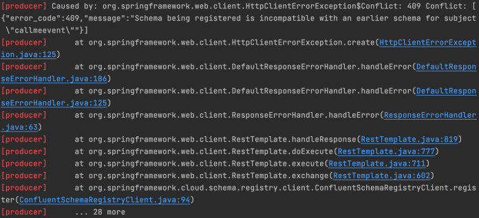 After restarting producer-service Spring Cloud Stream tries to register a new version of the schema. Let’s just take a look at application logs. As you see, a new schema has been rejected by the Confluent Schema Registry. Here’s a fragment of producer-service logs after a schema change.
