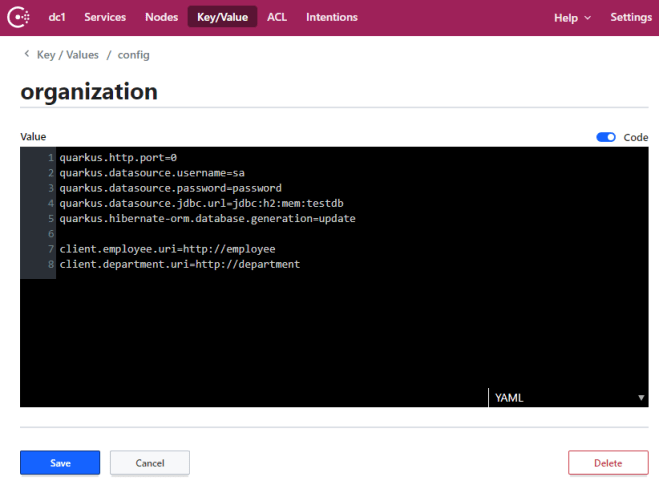 The Quarkus Config client reads properties from a KV store based on the location set in quarkus.consul-config.properties-value-keys property. Let’s create the settings responsible for a database connection and for enabling a random HTTP port feature.