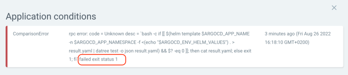 ArgoCD performs a policy check using Datree. As you probably remember this Helm chart does not meet the rules defined in Datree. Therefore the process exited with error code 1.
