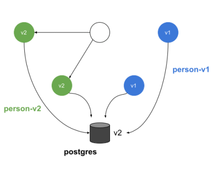 That is the last step in our blue-green deployment process on Kubernetes. The picture visible below illustrates the current status. The database schema has been updated. Also, the whole traffic is now sent to the v2 version of person-service.