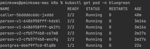 Ok, so here’s a list of deployments you need to start with Step 4. You see that every application has two containers inside a pod (except PostgreSQL). It means that Istio sidecar has been injected into those pods.