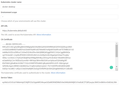 Now, we may configure the connection to the Kubernetes API. To do that you should go to the section “Kubernetes”, then click “Add Kubernetes cluster”, and finally switch to the tab “Connect existing cluster”. We need to provide some basic information about our cluster in the form. The name is required, and therefore I’m setting the same name as my Kubernetes context. You may leave a default value in the “Environment scope” field. In the “API URL” field I’m providing the internal address of Kubernetes API. It is http://kubernetes.default:443.