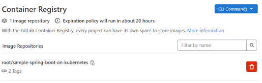 You can also take advantage of the integrated container registry. You just need to set the right name of a Docker image. It should contain the GitLab owner name and image name. In that case, it is root/sample-spring-boot-on-kubernetes. Iโm using my local Docker registry available at 172.17.0.2:5000.