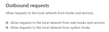 After login to the GitLab UI, you should enable local HTTP requests. Do that you need to go to the admin section. Then click “Settings” -> “Network” -> “Outbound requests”. Finally, you need to check the box “Allow requests to the local network from web hooks and services”. We will use internal communication between GitLab and Kubernetes API, and between the GitLab CI runner and the GitLab master.