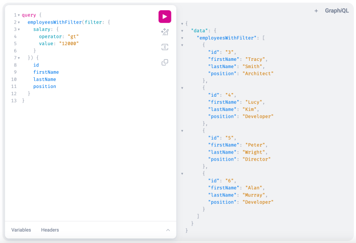 String query = "{ employeesWithFilter(filter: { salary: { operator: \"gt\" value: \"12000\" } }) { id firstName lastName salary } }";