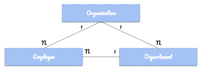 Firstly, you should go to the sample-app-spring-graphql directory. Our sample Spring Boot exposes API over GraphQL and connects to the in-memory H2 database. It uses Spring Data JPA as a layer to interact with the database. There are three entities Employee, Department and Organization. Each of them is stored in a separate table. Here’s a relationship model.
