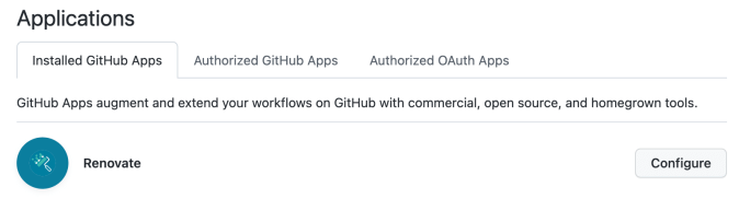 Renovate meets all these requirements. We can also easily install Renovate on GitHub and use it to update CircleCI configuration files inside repositories. In order to install Renovate on GitHub you need to go to the marketplace. After you install it, go the Settings, and then the Applications menu item. In order to set the list of repositories enabled for Renovate click the Configure button.