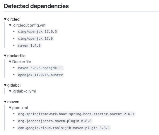 Here’s a list of detected package managers in this repository. Besides Maven and CircleCI, there is also Dockerfile and Gitlab CI configuration file there.