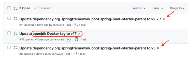 Some other pull requests are still waiting in the Open state – waiting for approval (a major update from Java 11 to Java 17) or for a fix because the build on CicrcleCI failed.