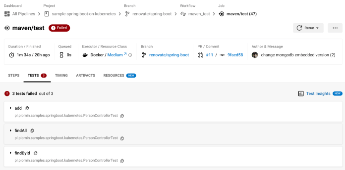 We can go to the details of the build. As you see in the CircleCI dashboard all the tests failed. In this particular case, I have already tried to fix the by updating the version of embedded Mongo. However, it didn’t solve the problem.