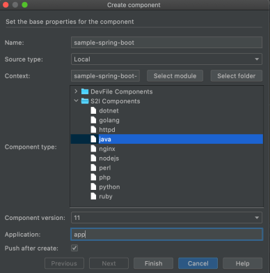 Ok, let’s by creating a new component. We need to choose java S2I type and then set a name of our component.