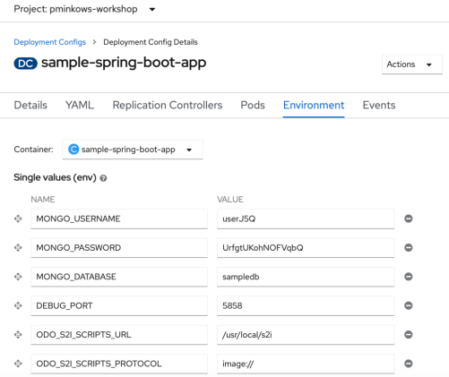 We can also navigate to the OpenShift Management Console. The environment variables set inside odo configuration has been applied to the DeploymentConfig.