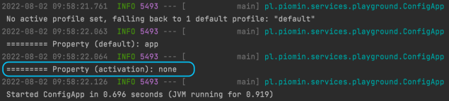 Finally, we can run the app. The following fragment of code LOG.info("========= Property (default): {}", propertyDefault) will print the value env. The environment variable overrides all other levels used in our example. In fact, that’s just a fifth config level of 14.