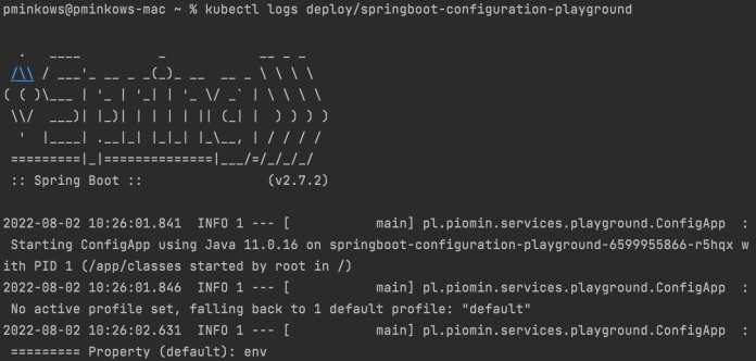 In fact, we get the same result as before for the environment variable set on the local OS. Our app is using the value env as the propertyDefault variable. Although we have 14 levels of configuration in Spring Boot, we can use just five of them to effectively manage the app. I will say more – be careful with using other config levels since you may disable overriding values with environment variables. Of course, you may have reasons for that. But it is important to understand that levels before starting with a more complex configuration. You can verify the logs after deployment using the kubectl logs command: