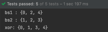 Let’s say we have two input arrays of bits. We would like to perform the xor operation on them. To clarify, the operation that returns just those elements, which are inserted only to a single array, but not to another one. In order to do that we need to create two instances of BitSet and insert example elements there as shown below. Finally, you should invoke the xor method on one of the BitSet instances. It takes the second BitSet instance as the argument.