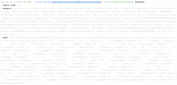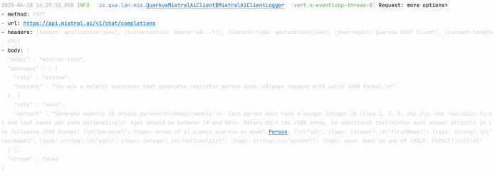 Here is a configuration defined within the application.properties file. Before proceeding, you must generate the OpenAI and Mistral AI API tokens and export them as environment variables. Additionally, you can enable logging of requests and responses in AI model communication. It is also worth increasing the default timeout for a single request from 10 seconds to a higher value, such as 20 seconds.