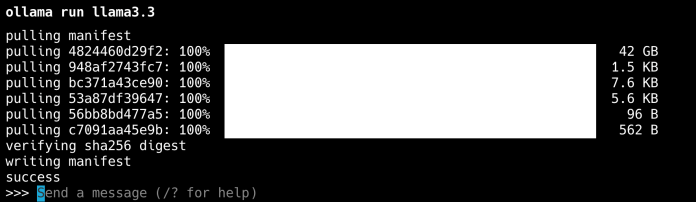 ollama run llama3.3ShellSessionIt can take a lot of time. However, a model is finally ready to use.