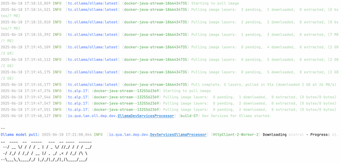 With the Quarkus LangChain4j Ollama extension, you can take advantage of dev services support. It means that you don’t need to install and run Ollama on your laptop or run a model with ollama CLI. Quarkus will run Ollama as a Docker container and automatically run a selected AI model on it. In that case, you don’t need to set the quarkus.langchain4j.ollama.base-url property. Before switching to that option, let’s use a smaller AI model by setting the quarkus.langchain4j.ollama.chat-model.model-id = mistral property. Then start the app in the same way as before.