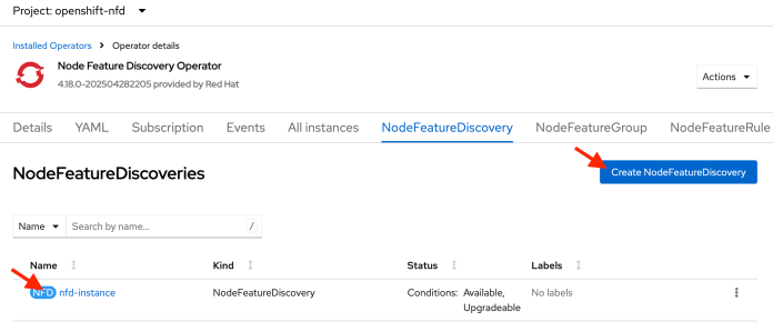 Next, install and configure several operators on the cluster. Begin with the “Node Feature Discovery” operator. On OpenShift, this operator enables automatic discovery of cluster nodes with features such as GPUs. After installing the operator, create the NodeFeatureDiscovery object. The default values set by the OpenShift console during object creation are sufficient.