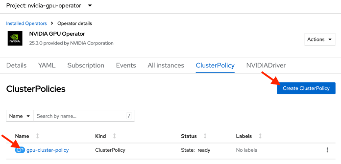 ip-10-0-45-120.us-east-2.compute.internal Ready worker 15d v1.31.6ShellSessionNext, install the NVIDIA GPU Operator. This operator automatically installs, configures, and manages NVIDIA drivers and tools on nodes with NVIDIA graphics cards. This allows OpenShift to recognize the GPU as a resource that can be declared in pods. This will enable OpenShift to work with the “Node Feature Discovery” operator to label nodes with GPUs. The NVIDIA GPU operator uses the feature.node.kubernetes.io/pci-10de.present=true label to determine where to install the drivers. For this to happen, the ClusterPolicy object must be created. As before, you can use the default values generated by the OpenShift Console when creating this object.