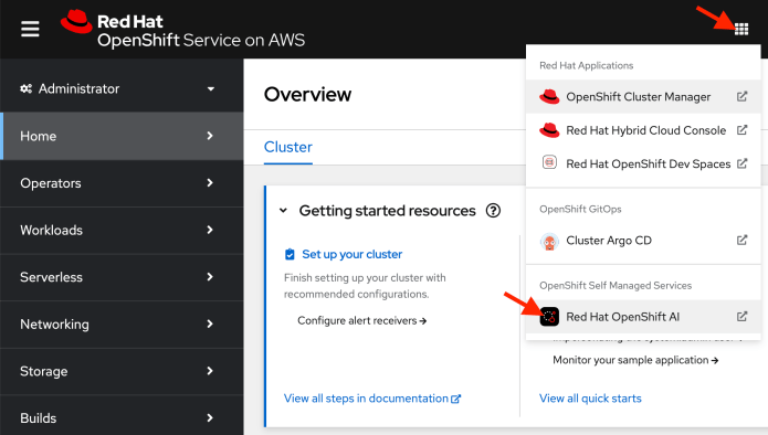 After installing OpenShift AI on a cluster, you can use its graphical UI. To access it, select “Red Hat OpenShift AI” from the menu at the top of the page.