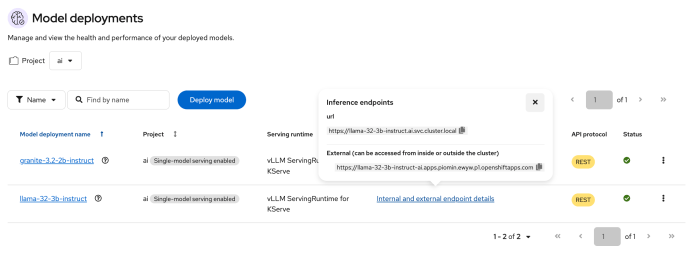 The OpenShift AI UI lists all the models running in a given AI project. You can check the endpoint where a particular model is available. In this case, two models are running in the AI project: Llama 3.2 and Granite 3.2. Both models are available internally on the cluster and externally via the Knative Route object.