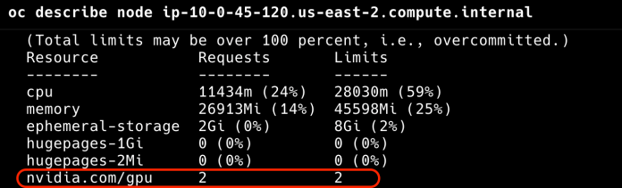 Both models are automatically exposed on the node with the GPU. You can check the GPU resource reservations on a node using the oc describe command: