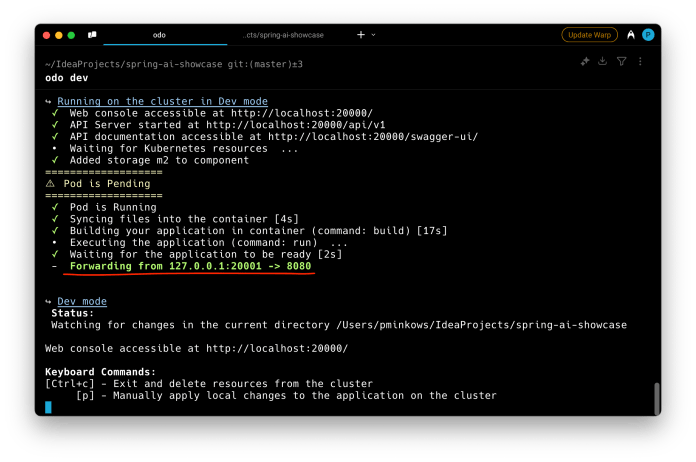 odo devShellSessionAfter that, the application should be deployed in the selected namespace and available for testing on the 20001 local port, thanks to the port-forwarding feature.